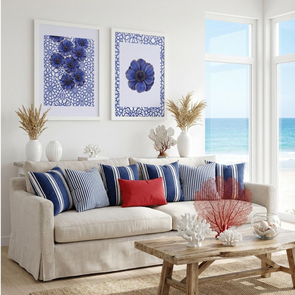 Because the palette remains controlled, Mediterranean blues, soft whites, natural wood, these pieces adapt easily to modern living rooms and coastal-inspired interiors.