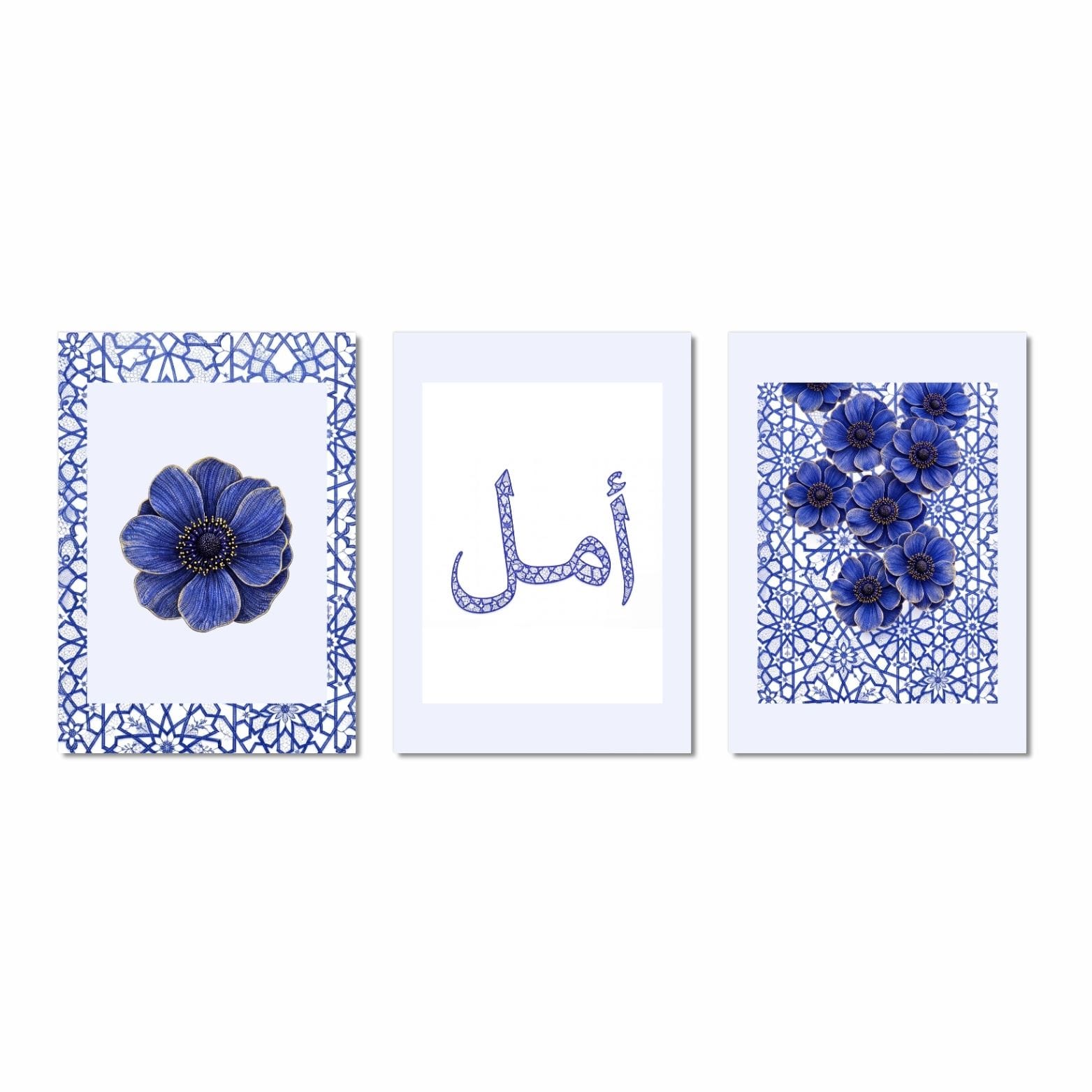 A complete three-piece blue floral Islamic wall art set featuring Amal calligraphy and blue botanical geometric lace prints. Designed to work together as a calm, modern focal point in living rooms and bedrooms. Instant digital download.