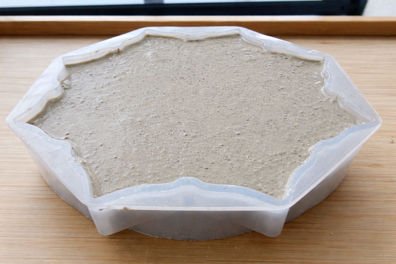 Geometric silicone mold filled with wet concrete for a handmade candleholder DIY