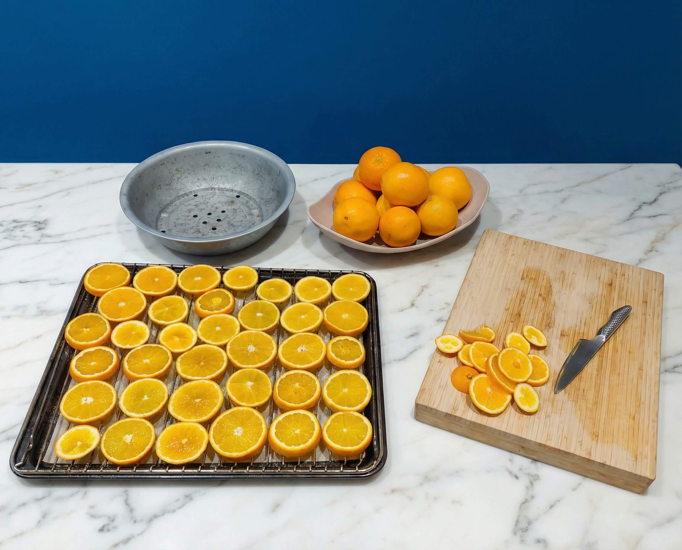 Slice the oranges into rounds, about 0.5–0.8 cm thick. Try to keep them fairly even, but small variations are welcome — they add character later.