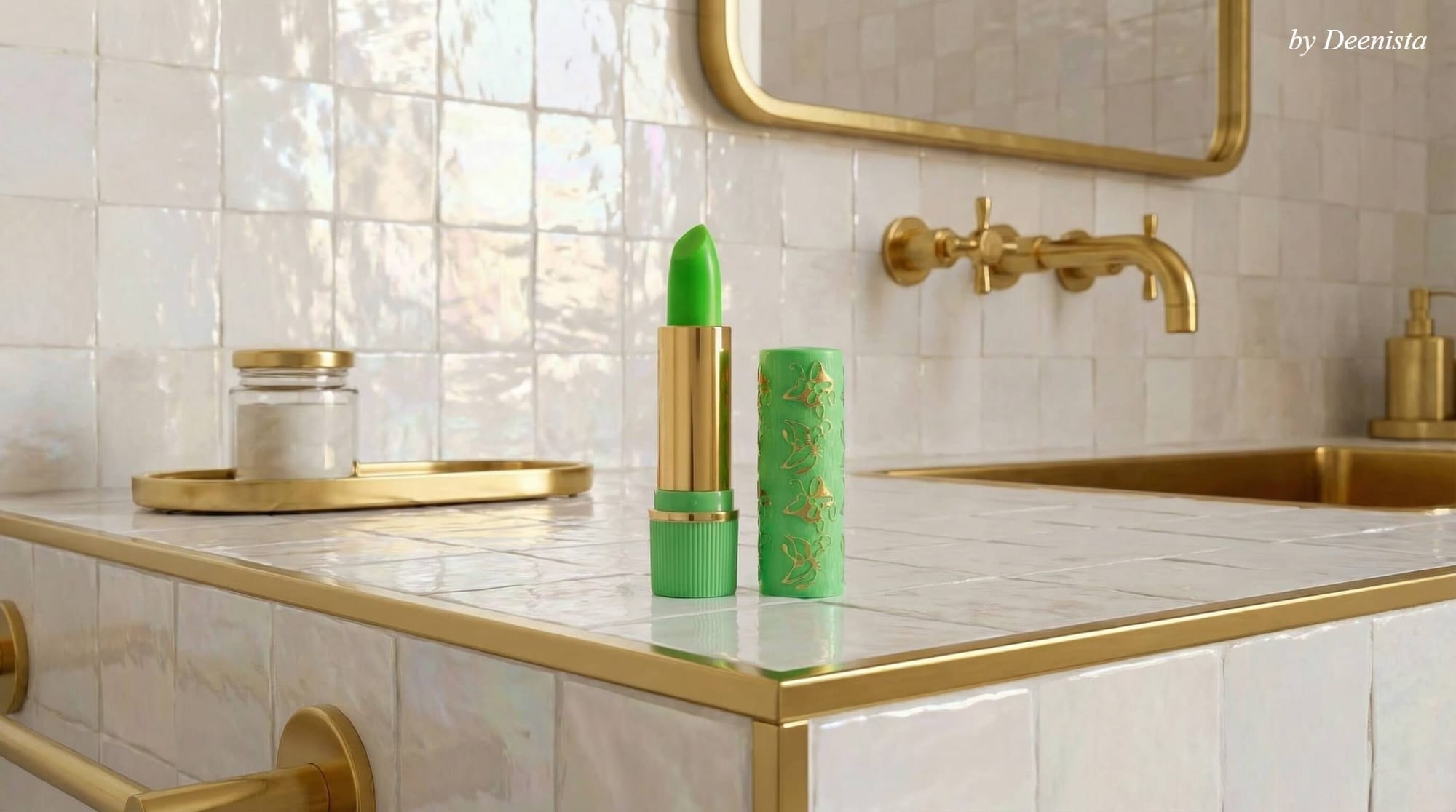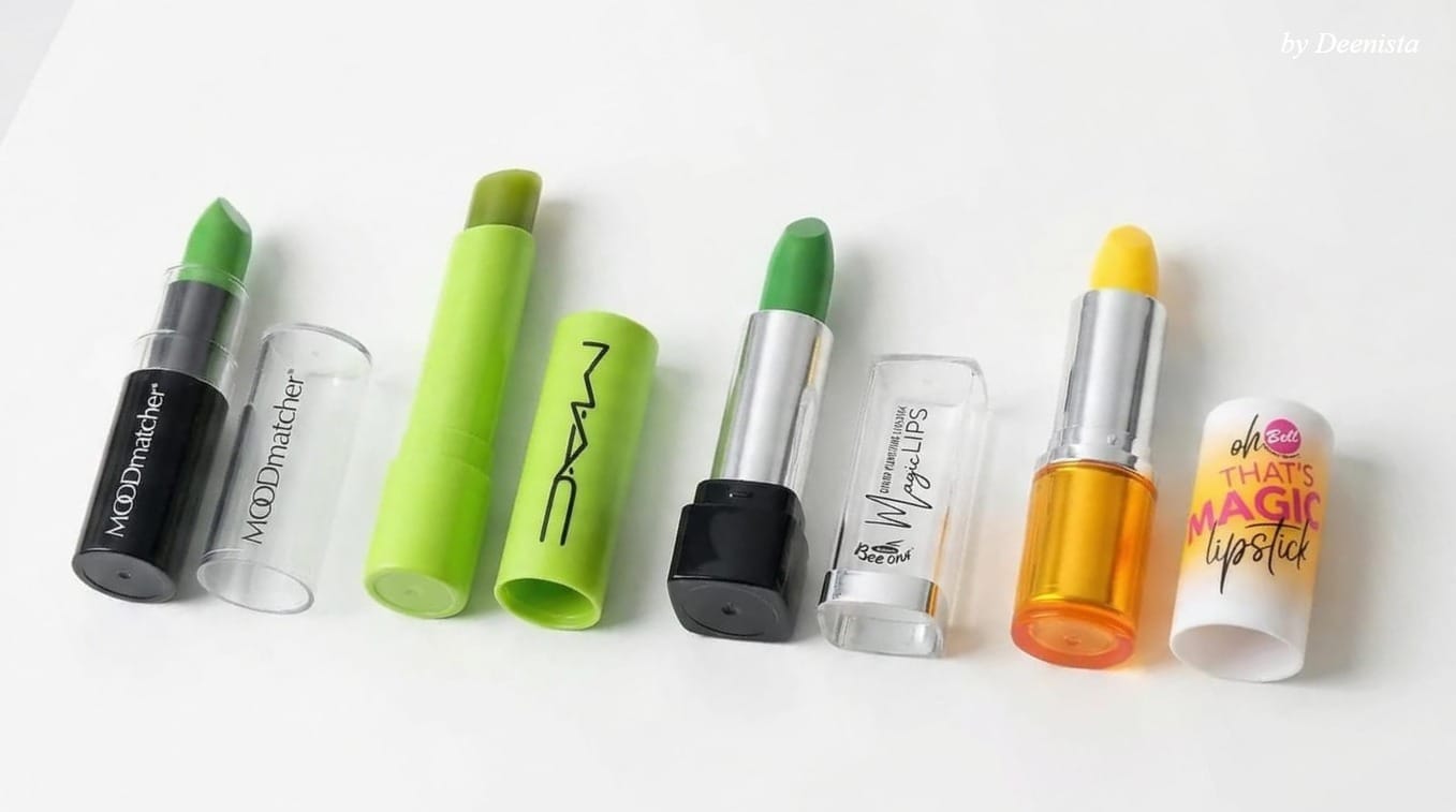 The tube is green, but the colour itself comes from a classic dye used for decades in traditional “magic” lipsticks: most commonly Red 27 or Red 21.