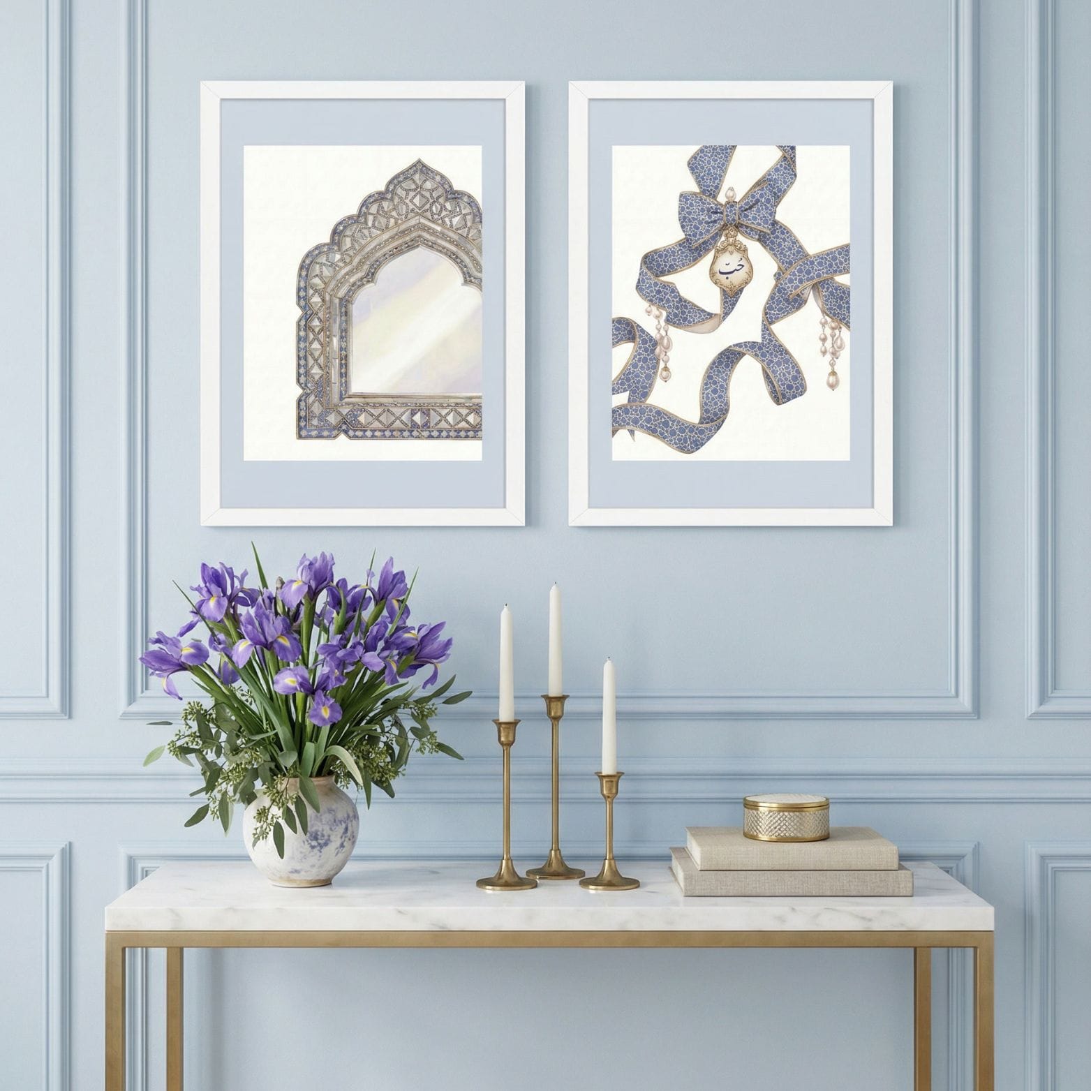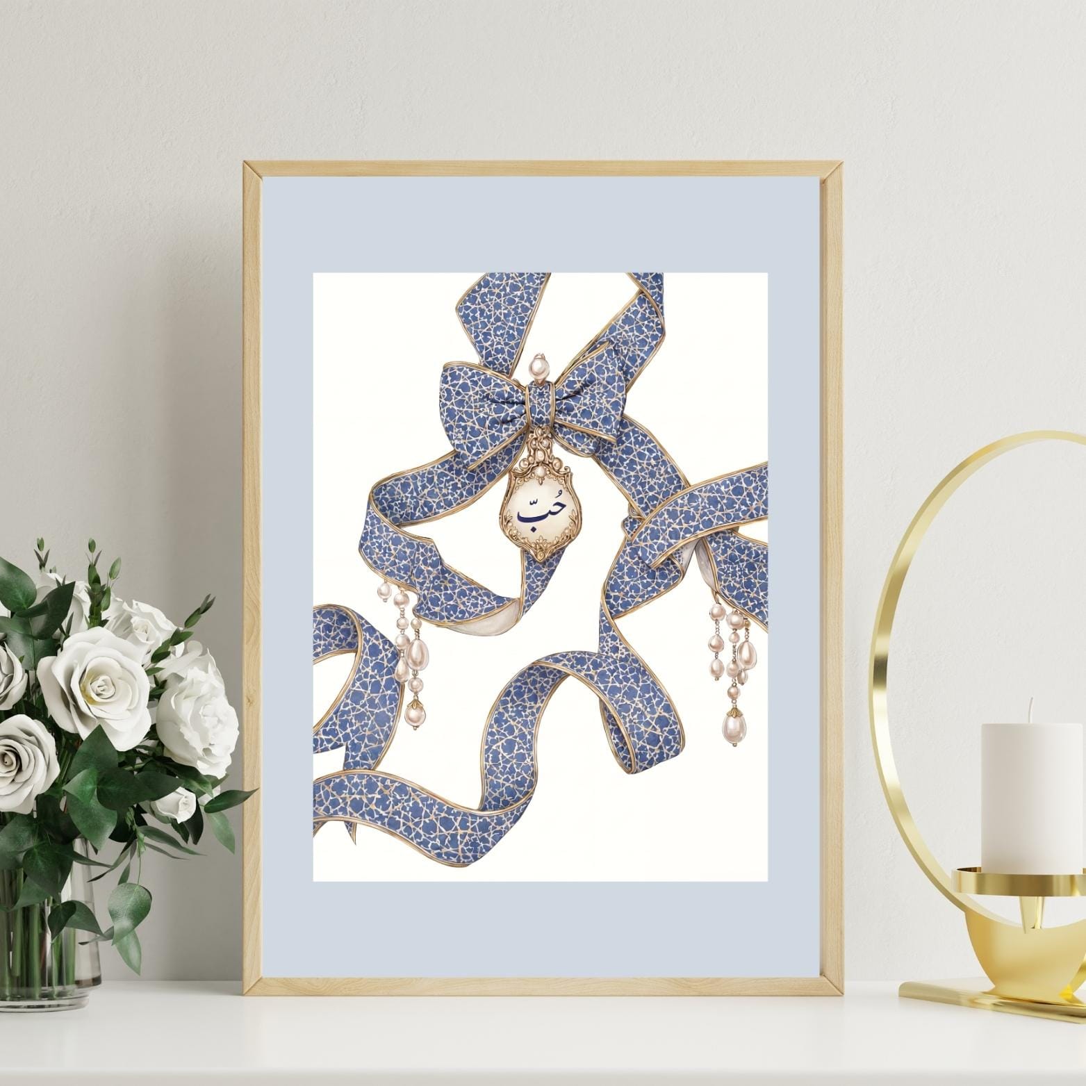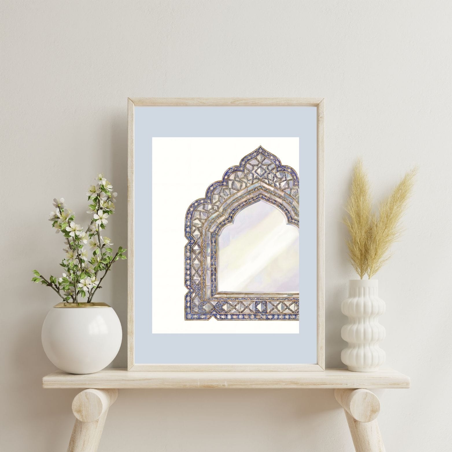 Islamic-inspired mirrorwork arch in blue and brass details, reflecting light and love.